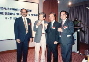 – Thực ra chuyến về thăm Việt Nam lần đầu tiên là vào đầu năm 1988, tôi đưa một đoàn doanh nghiệp Canada về, nhưng lần đó chỉ gồm vài công ty. Cục Phát triển thương mại Singapore là phái đoàn chính thức của Nhà nước Singapore gồm nhiều tập đoàn tư nhân và công ty thuộc quỹ đầu tư Temasek của chính phủ.